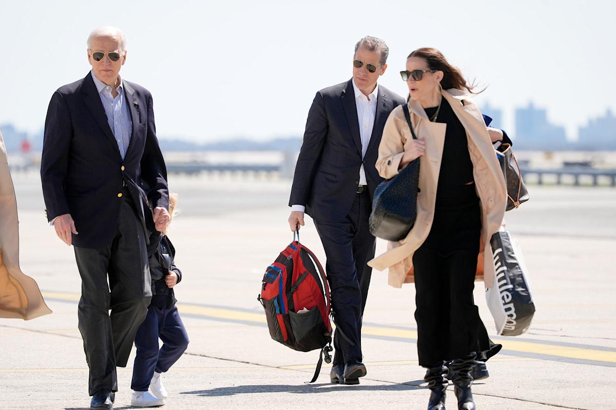 يسير الرئيس جو بايدن ، الذي يحمل أيديه مع حفيد باين ، مع الابن هانتر بايدن وابنته آشلي بايدن أثناء السير على متن الطائرة الجوية في نيويورك في 29 مارس 2024.