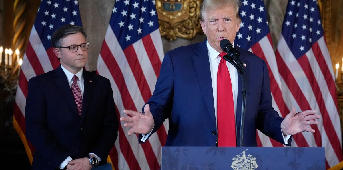 الرئيس السابق دونالد ترمب دافع رئيس مجلس النواب مايك جونسون (جمهوري عن لوس أنجلوس) يوم الجمعة وسط تهديدات لرئاسته من فصيل من الجمهوريين اليمينيين المتطرفين الغاضبين من اعتماده على أصوات الديمقراطيين لتمرير التشريع.