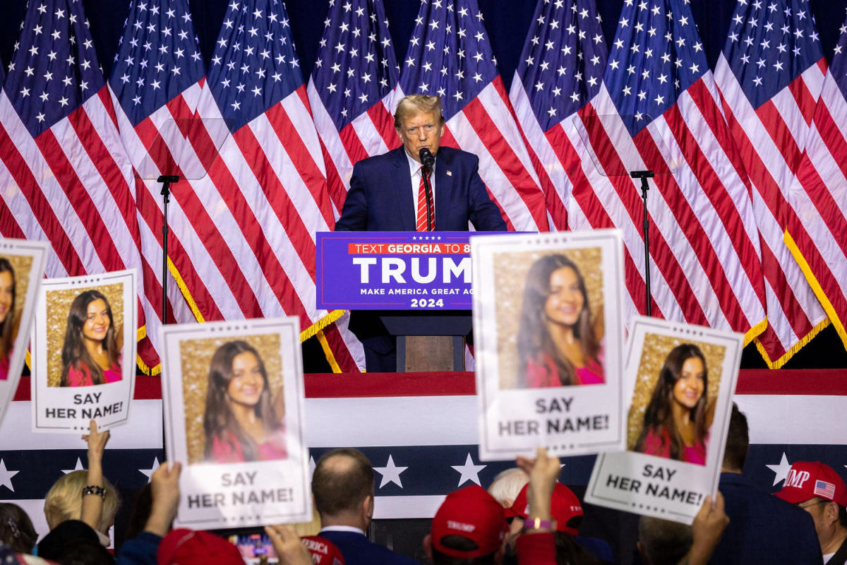 يتحدث دونالد ترامب عن Laken Riley في مسيرة في روما ، جورجيا ، في 9 مارس.