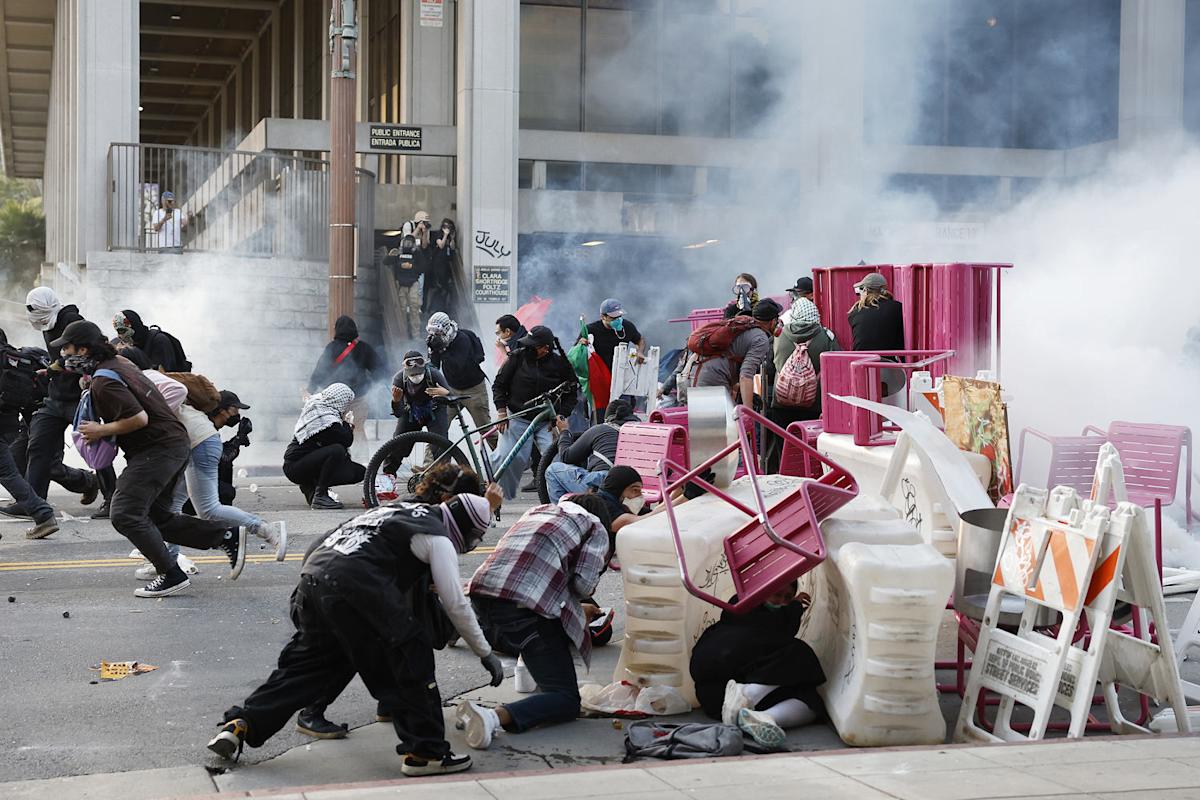 اصطف مؤيدو ترامب خلفه ، مع بعضهم حتى يعرض البعض للتوجه إلى لوس أنجلوس للمساعدة ، على الرغم من عدم وجود خبرة في إنفاذ القانون.