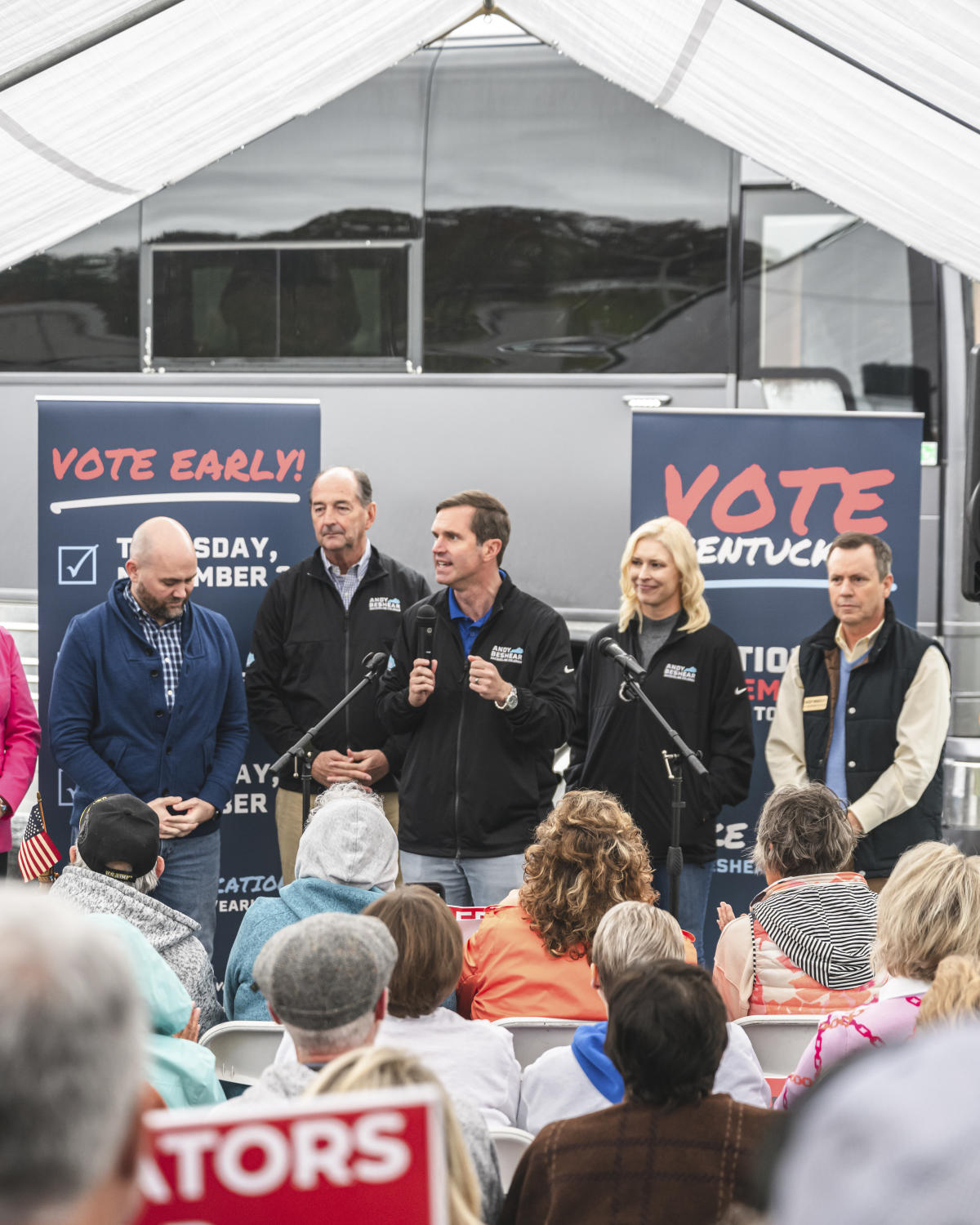 — في ولاية كنتاكي، حاكم الولاية. ، وهو ديمقراطي يترشح لإعادة انتخابه، يركز على دعمه لحقوق الإجهاض (بينما يروج أيضًا لثمار سياسات بايدن الاقتصادية دون تسمية بايدن).