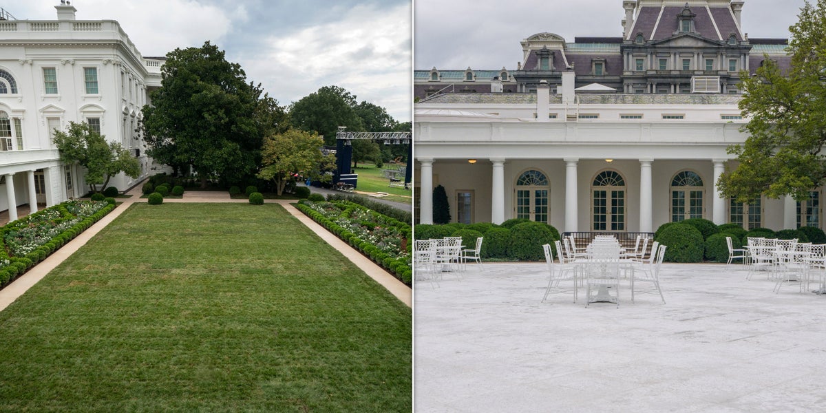 تم استبدال العشب الأخضر في وسط الحديقة ، المستخدم لعقود من الزمن لأحداث البيت الأبيض ، بما بدا أنه حجر أبيض. بقيت بعض أوراق الشجر ، مع شجيرات الورد والتحوطات المتاخمة لمنطقة الفناء الجديدة.