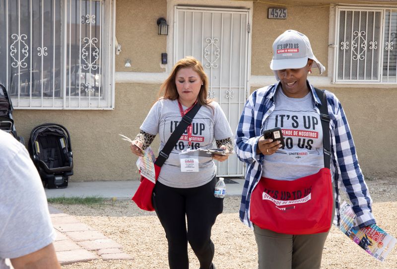 في لاس فيجاس، اجتمعت روسيليا ميندوزا مع زملائها في قاعة اتحاد الطهي بعد ظهر أحد الأيام من الشهر الماضي للتحضير ليوم من طرق الأبواب، على الرغم من الحرارة الخانقة، لتشجيع أعضاء النقابة الآخرين على التصويت لصالح هاريس.