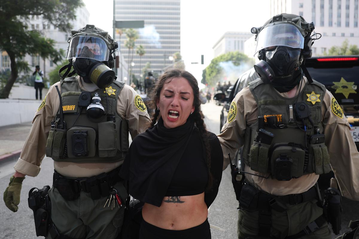 في هذه الأثناء ، عبر المتظاهرون عن غضبهم من لقطات من وكلاء الإنفاذ في الهجرة والجمارك الذين يغطيون وجوههم في غارات الهجرة والضباط المقنعين في احتجاجات لوس أنجلوس ، ووصفوها بمستوى مزدوج.