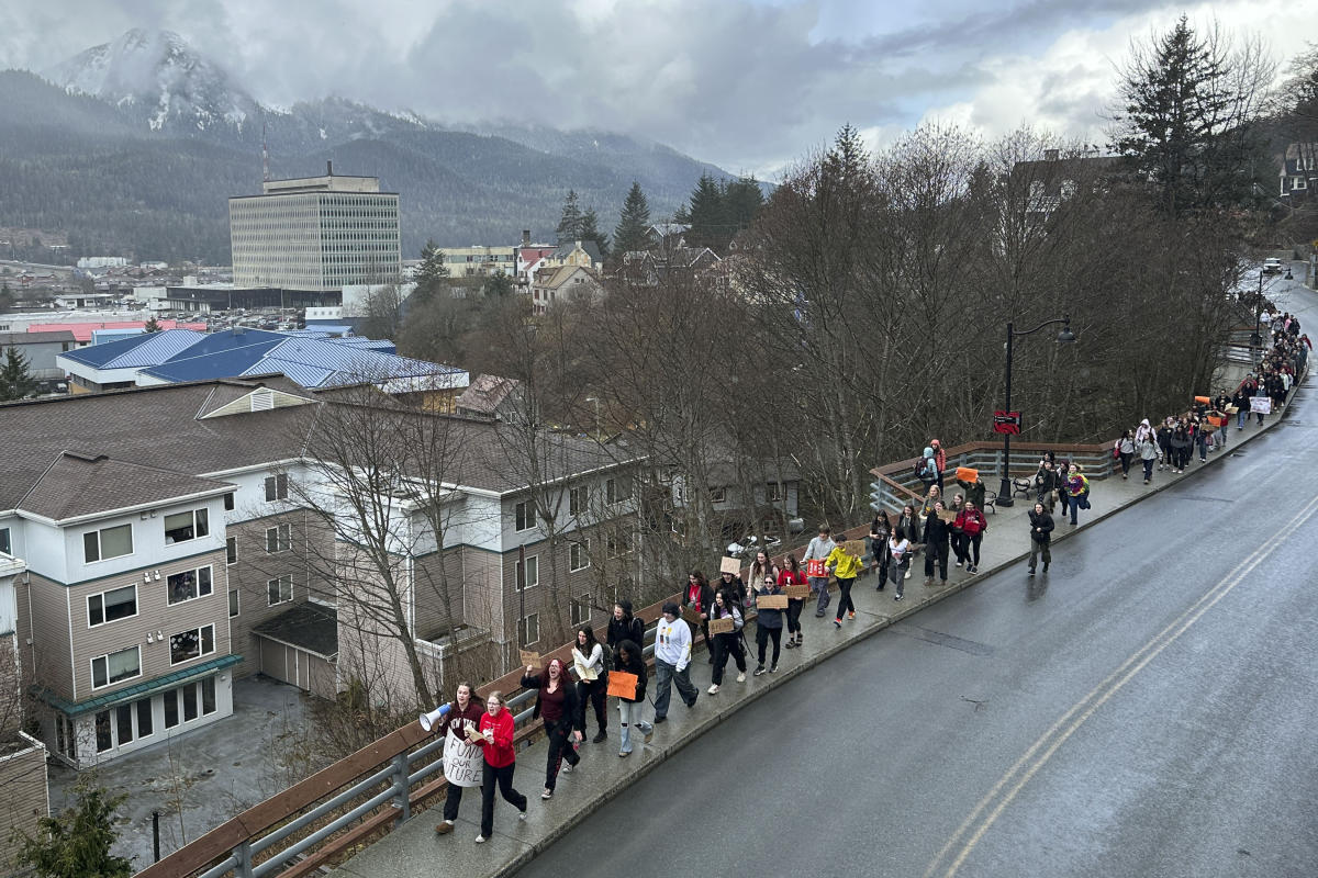 يونيو ، ألاسكا (AP) – خرج الطلاب في عاصمة ألاسكا من المدرسة يوم الخميس وساروا عبر قاعات مبنى الولاية للاحتجاج على حق النقض الأخير الذي استخدمه الحاكم الجمهوري مايك دونليفي على التعليم وفشل الهيئة التشريعية في تجاوزه.