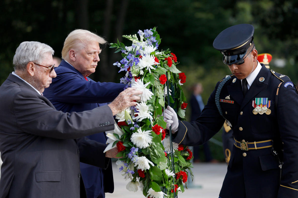 وتوجه ترامب إلى المقبرة تحت المطر البارد وبدأ الزيارة بوضع إكليل من الزهور على قبر الجندي المجهول. كان يرتدي معطفًا داكنًا وقفازات في البرد، ووقف بوقار بعد أن وضع إكليلًا من الزهور وأدى التحية. نائب الرئيس المنتخب جيه دي فانس وشخصين فقدوا أفرادًا من عائلاتهم في القتال قووقف إلى جانب ترامب ووضع أكاليل الزهور أيضًا.