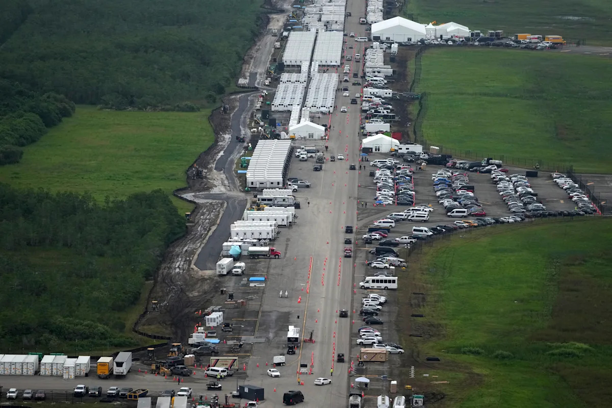 يتحدث المحامون والدعاة والمحتجزين والعائلات عن إدارة المحتجز المهاجرة المؤقتة. بدأ المركز في قبول المحتجزين في 2 يوليو.
