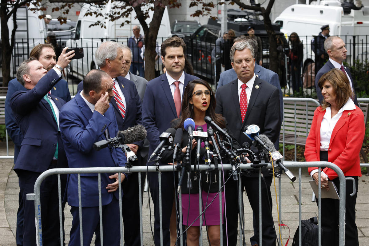 أولئك الذين سافروا معه أو جلسوا في المقاعد قاموا أيضًا بتنسيق تصريحات إعلامية خارج مبنى المحكمة – حيث غالبًا ما كانوا ينطقون بالكلمات التي يُحظر على ترامب نفسه أن يقولها.