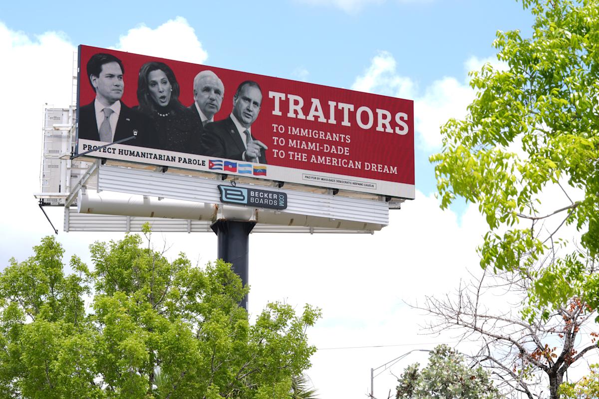 أنشأ الديمقراطيون في ميامي لوحة إعلانية على طريق صريح تُسافر بشدة يوضح أعضاء مجلس النواب الثلاثة ووزير الخارجية ماركو روبيو ، وهو عضو سابق في ولاية فلوريدا ، وهو أيضًا من أصل كوبي ، مع علامة “الخونة”.