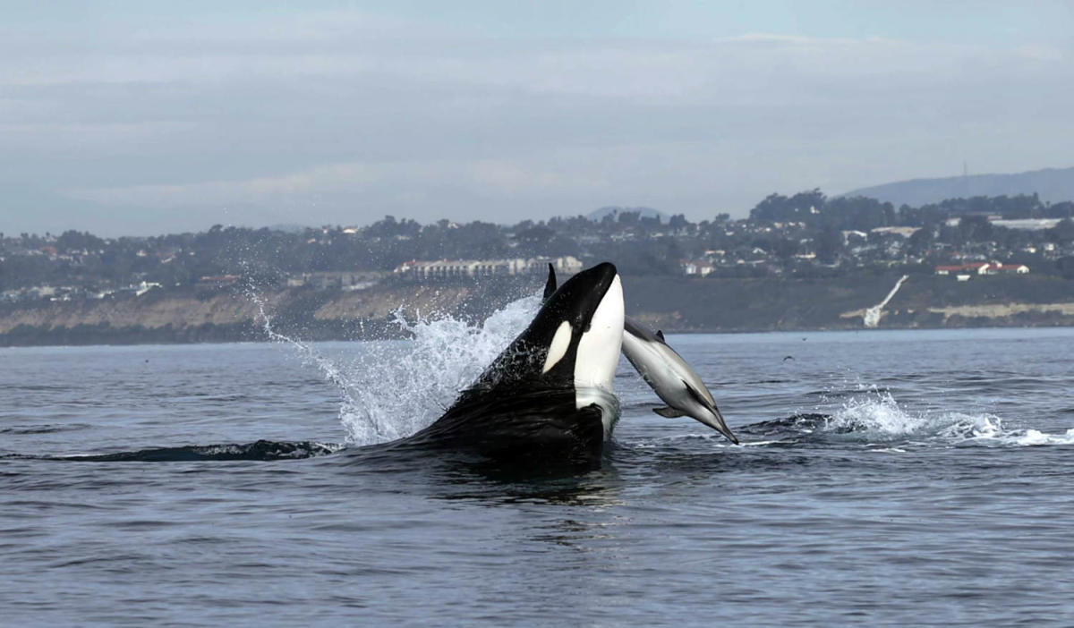 في مقطع فيديو نادر تم التقاطه خلال رحلة استكشافية لمشاهدة الحيتان قبالة سواحل سان دييغو هذا الأسبوع، يقوم حوت قاتل بتعليم صغيره كيفية الصيد عن طريق ضرب الدلفين برأسه، مما يجعله يتقلب عدة مرات في الهواء.