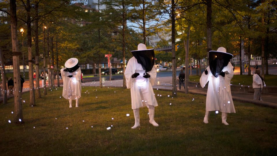 عمل آخر حديث أظهر فنانين بشريين كجزء من التثبيت في دورتموند، ألمانيا. تحت عنوان “Sympoiesis”، كان هناك “مربي نحل مستقبليون” يتفاعلون ويفحصون ويوزعون آلاف الأضواء الصغيرة التي من المفترض أن تشبه الحشرات.