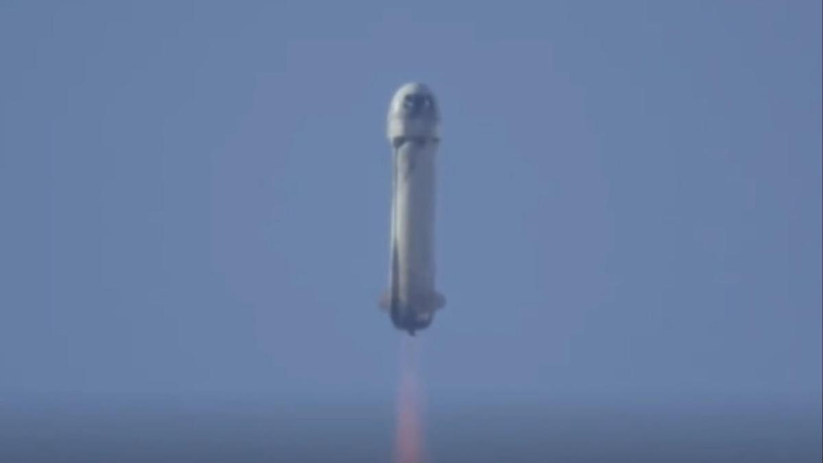 إنه يتسلق شبارد روكيت وكبسولة الطاقم الجديدة من موقع إطلاق غرب تكساس في Blue Origin في رحلة الفضاء في المداخن الثاني عشر للشركة. / الائتمان: البث الشبكي الأصل الأزرق