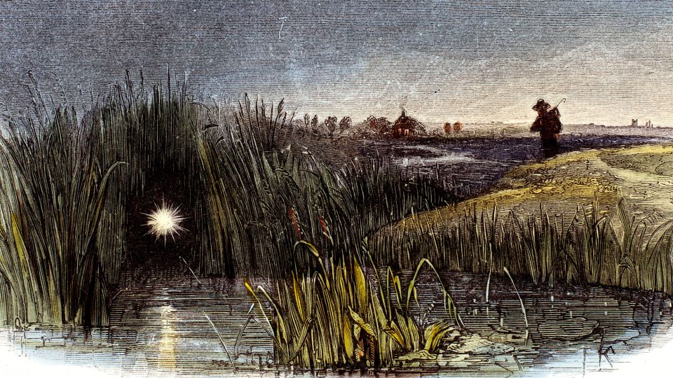 قد يكون للتوهج الطيفي لـ will-o’-the-wisp، الذي تم تصويره بهذه التفاصيل من نقش ليوشيا وود ويمبر الذي نُشر في كتابه “ظواهر الطبيعة” عام 1849، تفسيرًا علميًا: ومضات صغيرة من البرق تشعل فقاعات الميثان المجهرية. – مكتبة صور العلوم والمجتمع / صور غيتي
