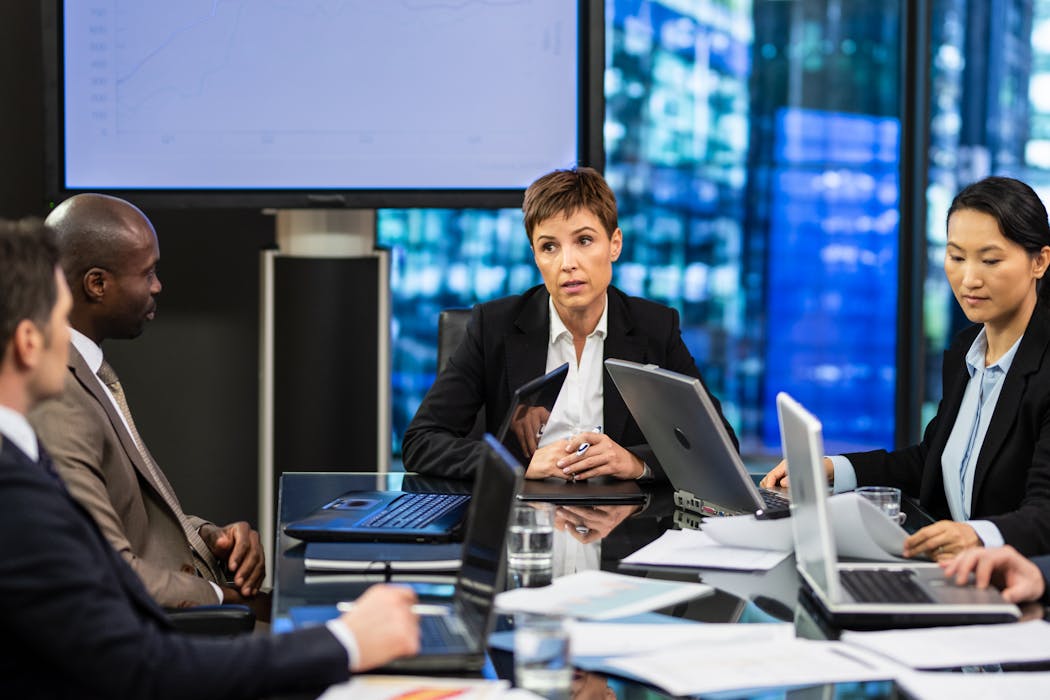 أشخاص يجلسون حول طاولة في غرفة الاجتماعات ويمكن رؤيتهم من خلال جدار زجاجي