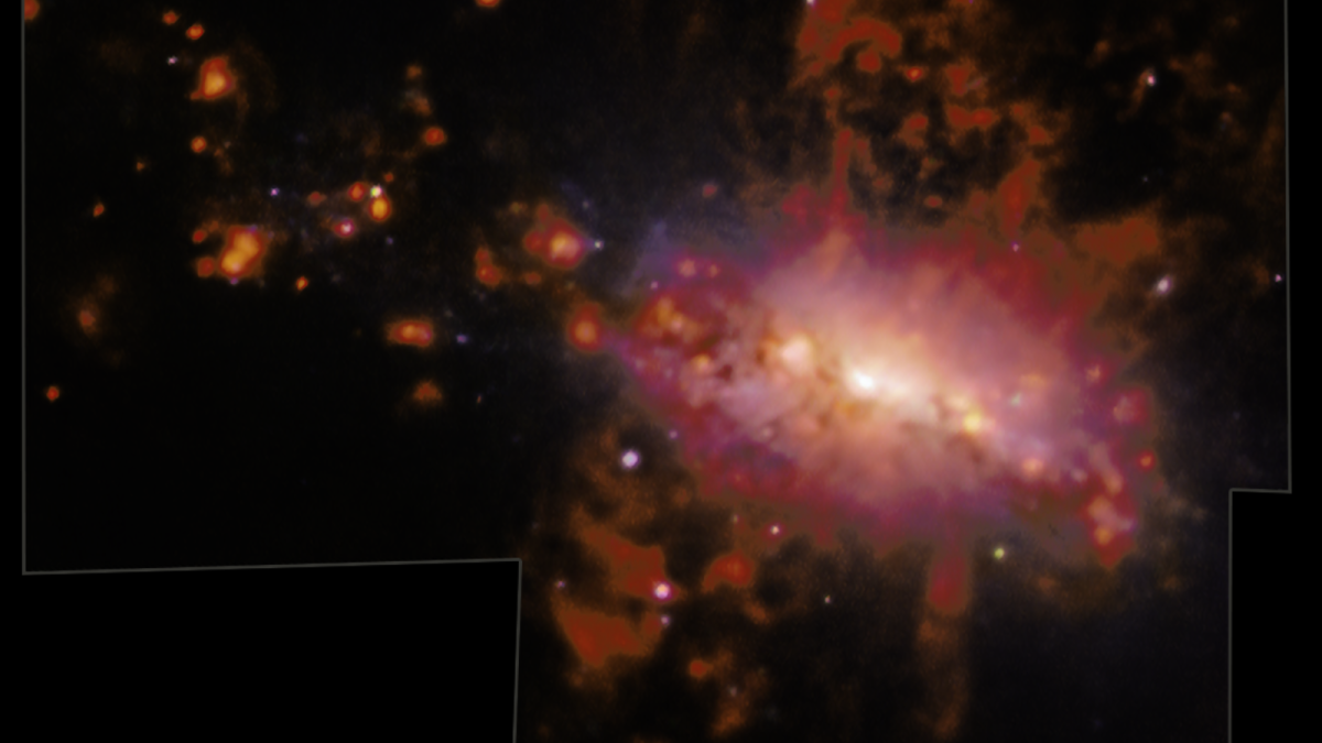 انفجارات هائلة في مجرة ​​قريبة من درب التبانة تصب مادة تعادل نحو 50 مليون شمس في محيطها. رسم علماء الفلك خريطة لحدث التلوث المجري هذا بدقة عالية، وحصلوا على تلميحات مهمة حول كيفية امتلاء الفضاء بين المجرات بالعناصر الكيميائية التي تصبح في النهاية اللبنات الأساسية للنجوم الجديدة.