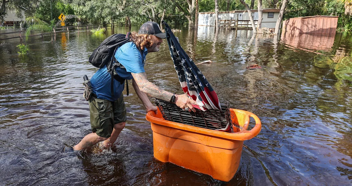 قارب إنقاذ يبحر في مياه الفيضانات في أعقاب إعصار ميلتون في كليرووتر، فلوريدا، في 10 أكتوبر 2024. (مايك ستيوارت / ا ف ب)
