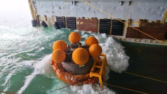 في الأسبوع الماضي، استعادت الأمة عافيتها جاجانيان وحدة الطاقم على سطح السفينة، والذي يفتح على البحر ويمكن غمره بالمياه بحيث يمكن رفع الوحدة بعد سقوطها وسحبها إلى الداخل.