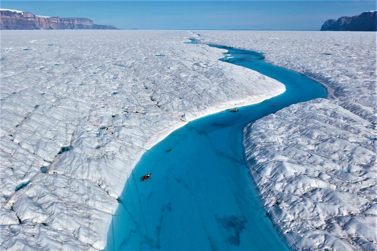 وعندما تصل إلى القاع، تتدفق المياه الذائبة إلى نظام الصرف تحت الجليدي للغطاء الجليدي ــ يشبه إلى حد كبير شبكة مياه الأمطار في المناطق الحضرية، على الرغم من أنها تتطور وتدعم باستمرار. فهو يحمل المياه الذائبة إلى حواف الجليد وينتهي بها الأمر في النهاية في المحيط، مع ما يترتب على ذلك من عواقب وخيمة على الديناميكا الحرارية وتدفق الغطاء الجليدي المغطي.