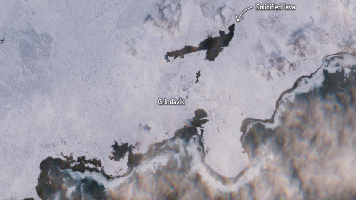 الأقمار الصناعية الصور التي التقطت في 27 يناير بواسطة وكالة الفضاء الأوروبيةتُظهر مهمة كوبرنيكوس سنتينل-2 التابعة لوكالة الفضاء الأوروبية (ESA) بقعًا داكنة من الحمم البركانية المتصلبة بالقرب من قرية غريندافيك لصيد الأسماك في شبه جزيرة ريكجانيس في أيسلندا. وقال مسؤولو وكالة الفضاء الأوروبية إن المناطق المغطاة بالحمم الصلبة تبرز على النقيض من الثلوج البيضاء المتساقطة حديثا تصريح وصف الصورة الجديدة.