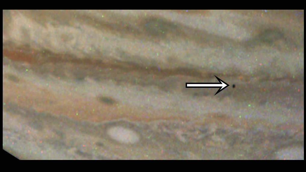 رصد جونو أمالثيا كنقطة سوداء صغيرة تصطدم أولاً بأحد أحزمة السحب الداكنة لكوكب المشتري ثم تعبر بقعة حمراء كبيرة بحد ذاتها. المقياس لا يصدق. البقعة الحمراء العظيمة هي عاصفة ضخمة مضادة للأعاصير يبلغ عرضه حاليًا 7767 ميلًا (12500 كم).بينما تم تصوير أمالثيا الصغيرة على ارتفاع 112.500 ميل (181.000 كيلومتر) فوق قمم سحب كوكب المشتري.