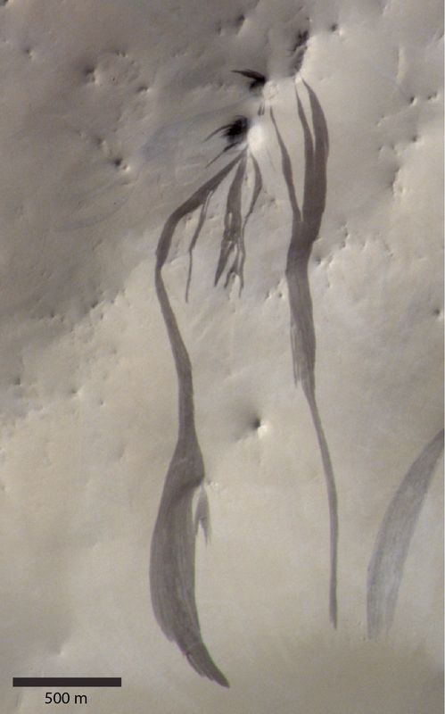 درس الباحثون أيضًا ميزات أقصر العمر تسمى Lineae Slope Lineae المتكرر ، أو RSL ، التي شوهدت في المقام الأول في المرتفعات الجنوبية المريخية. هذه تنمو في الصيف وتتلاشى في الشتاء التالي. تشير البيانات إلى أن هذه كانت مرتبطة أيضًا بالعمليات الجافة مثل شياطين الغبار – الزعاق من الغبار – والصخور.