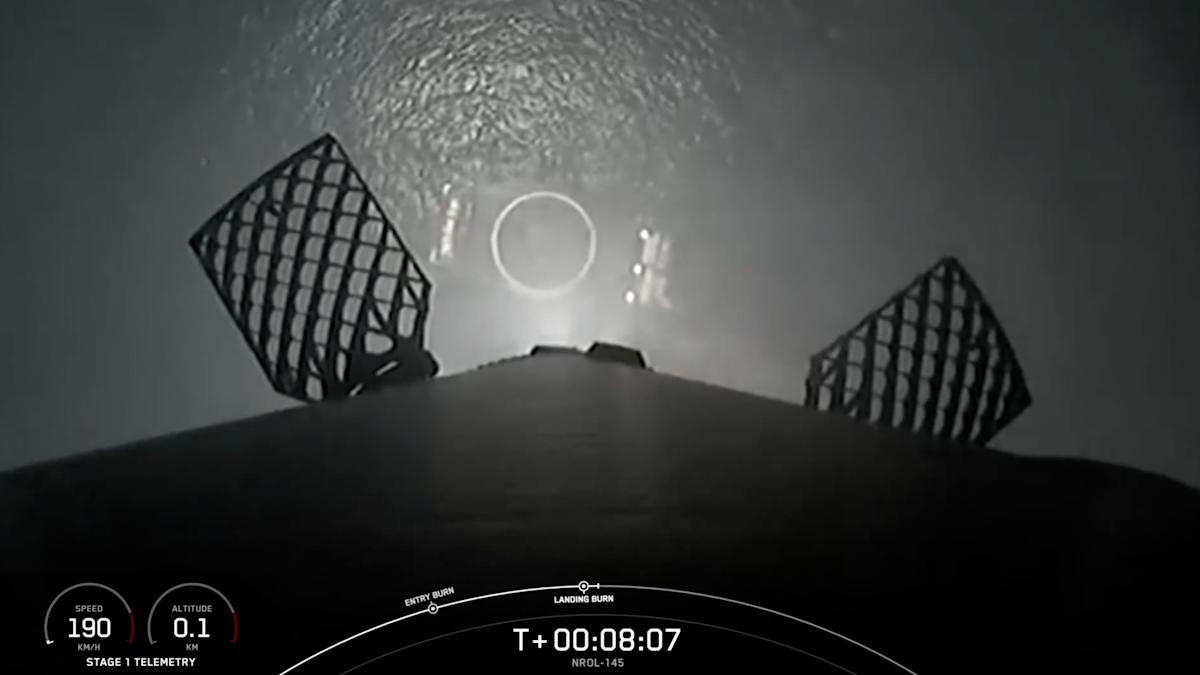 تعود المرحلة الأولى من صاروخ Spacex Falcon 9 للهبوط على متن سفينة في البحر بعد إطلاق مهمة NROL-145 لمكتب الاستطلاع الوطني الأمريكي من قاعدة فاندنبرغ الفضائية في كاليفورنيا في 20 أبريل 2025. الائتمان: SpaceX