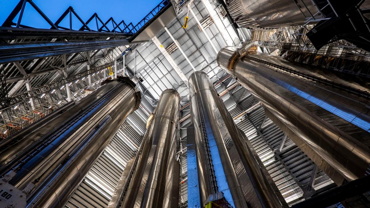 المبنى مليء بأسطوانات شاهقة من الفولاذ المقاوم للصدأ – مركبات ثقيلة للغاية، وهي المرحلة الأولى من صاروخ SpaceX’s Starship العملاق – والتي ترتفع تقريبًا إلى السطح.