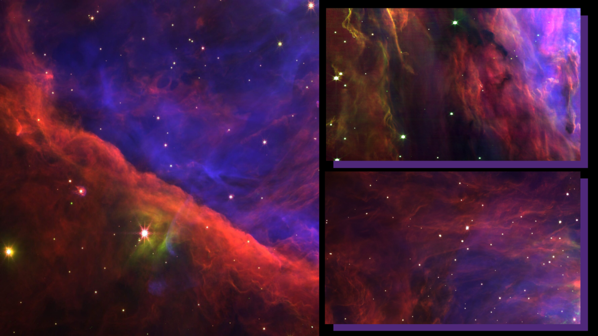تمت دراسة سديم أوريون، الذي يمكن رؤيته بالعين المجردة تحت سماء مظلمة، عبر تاريخ البشرية، لكن صور تلسكوب جيمس ويب الفضائي تظهره بتفاصيل غير مسبوقة. على وجه الخصوص، قام التلسكوب الفضائي القوي بتكبير الصورة المائلة للغاز والغبار التي تشبه التلال في الربع السفلي الأيسر من M42 والتي تسمى “شريط أوريون”.