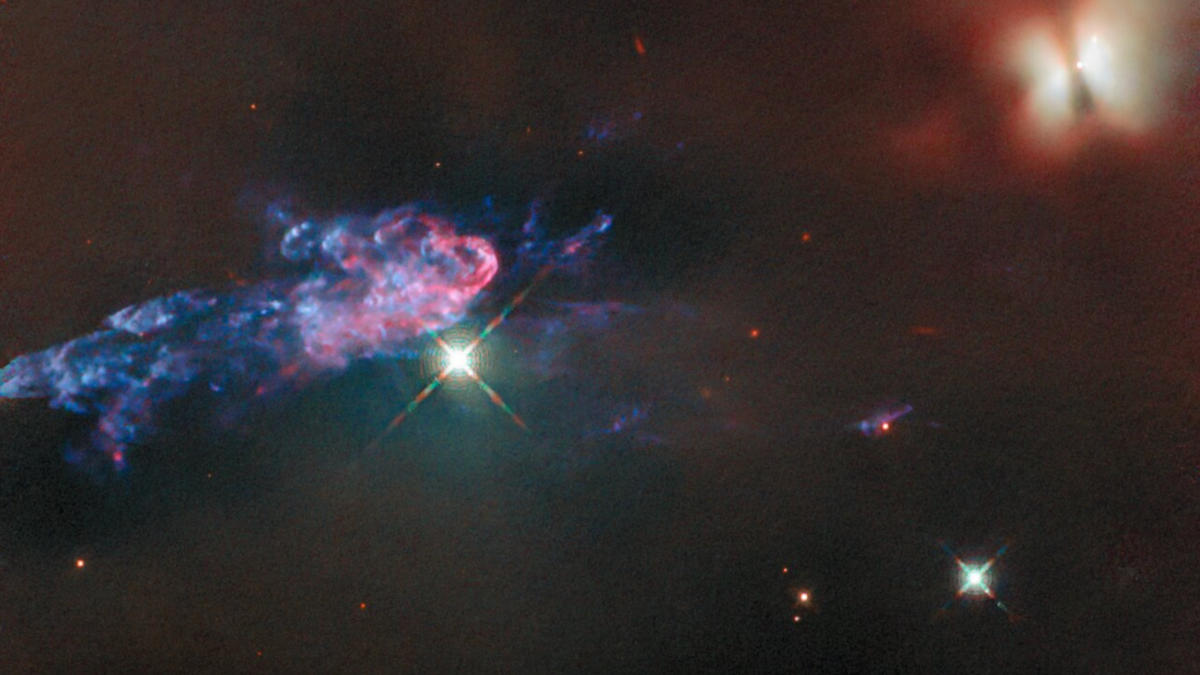 التقط تلسكوب هابل الفضائي نجمين شابين يدعى HOPS 150، والذي يتوهج باللون الأحمر الذهبي الساطع في الزاوية العلوية اليمنى من الصورة، وHOPS 153، الذي يقع على الجانب الأيسر من الصورة، ويمثله تدفق ضيق ملون. في سديم أوريون. . | حقوق الصورة: وكالة الفضاء الأوروبية/هابل وناسا، تي ميجيث