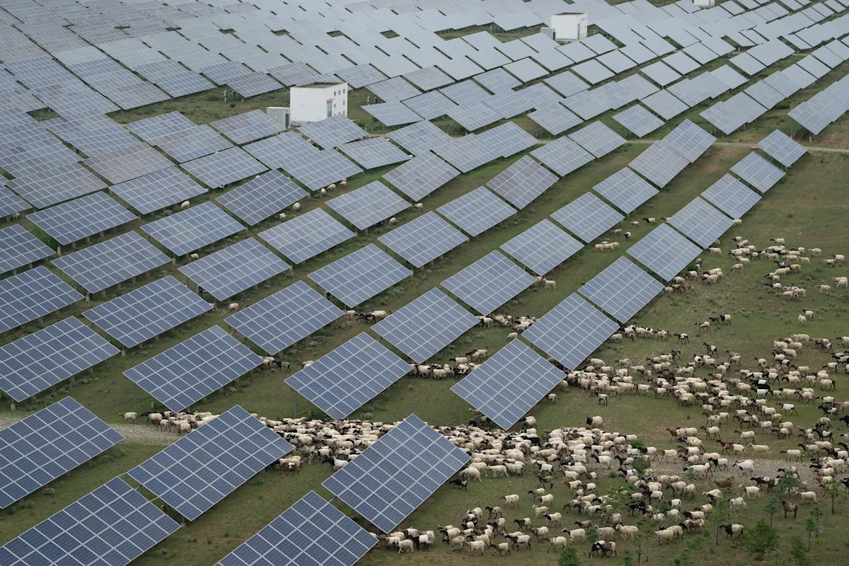 يمتد امتداد لا نهاية له من الألواح الشمسية باتجاه الأفق على هضبة التبت. المباني البيضاء المكونة من طابقين ترتفع فوقها على فترات منتظمة. رعي الأغنام على الغطاء النباتي الفكوري الذي ينمو تحتها.
