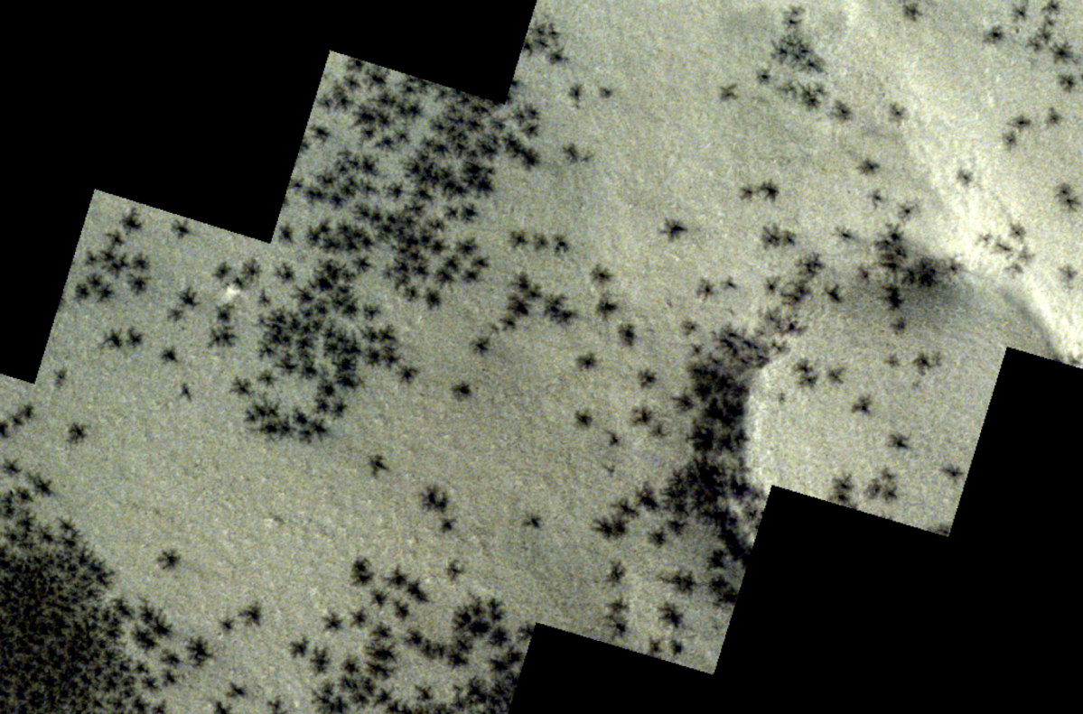 قالت وكالة الفضاء الأوروبية في بيان صحفي إن إحدى مركباتها المدارية Mars Express التقطت صورًا لـ “العناكب”، وهي في الواقع مجرد سمات صغيرة داكنة اللون تبدأ في التشكل عندما تسقط أشعة الشمس على ثاني أكسيد الكربون المترسب خلال أشهر الشتاء على الكوكب. وقالت وكالة الفضاء إن الضوء يتسبب في تحول جليد ثاني أكسيد الكربون الموجود في قاع الرواسب إلى غاز، والذي ينفجر في النهاية عبر الجليد الذي يمكن أن يصل سمكه إلى ثلاثة أقدام، ويطلق الغبار في انفجارات تشبه السخان قبل أن يستقر على السطح. .