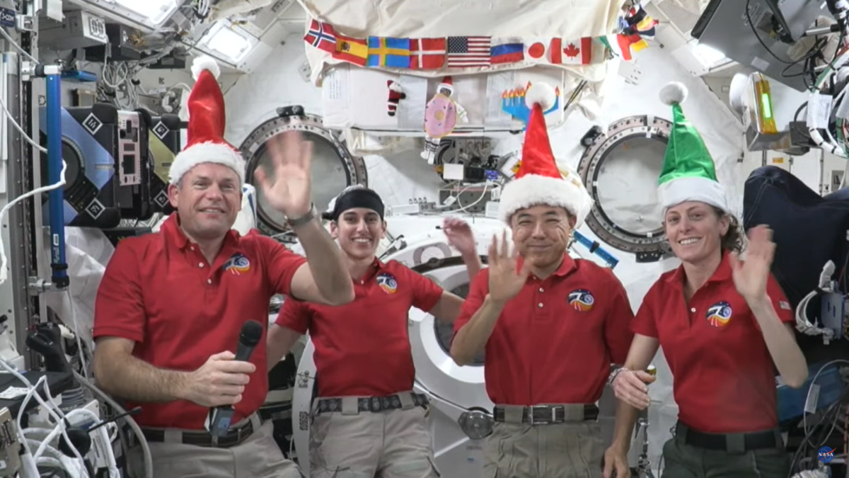 انضم رائدا فضاء ناسا، ياسمين مقبلي ولورال أوهارا، وهما يرتديان قبعات سانتا الحمراء والخضراء، إلى قائد البعثة 70 بالمحطة أندرياس موجينسن وكالة الفضاء الأوروبية و ساتوشي فوروكاوا من اليابان لمشاركة ما يعنيه قضاء العطلات بعيدًا عن الأرض.