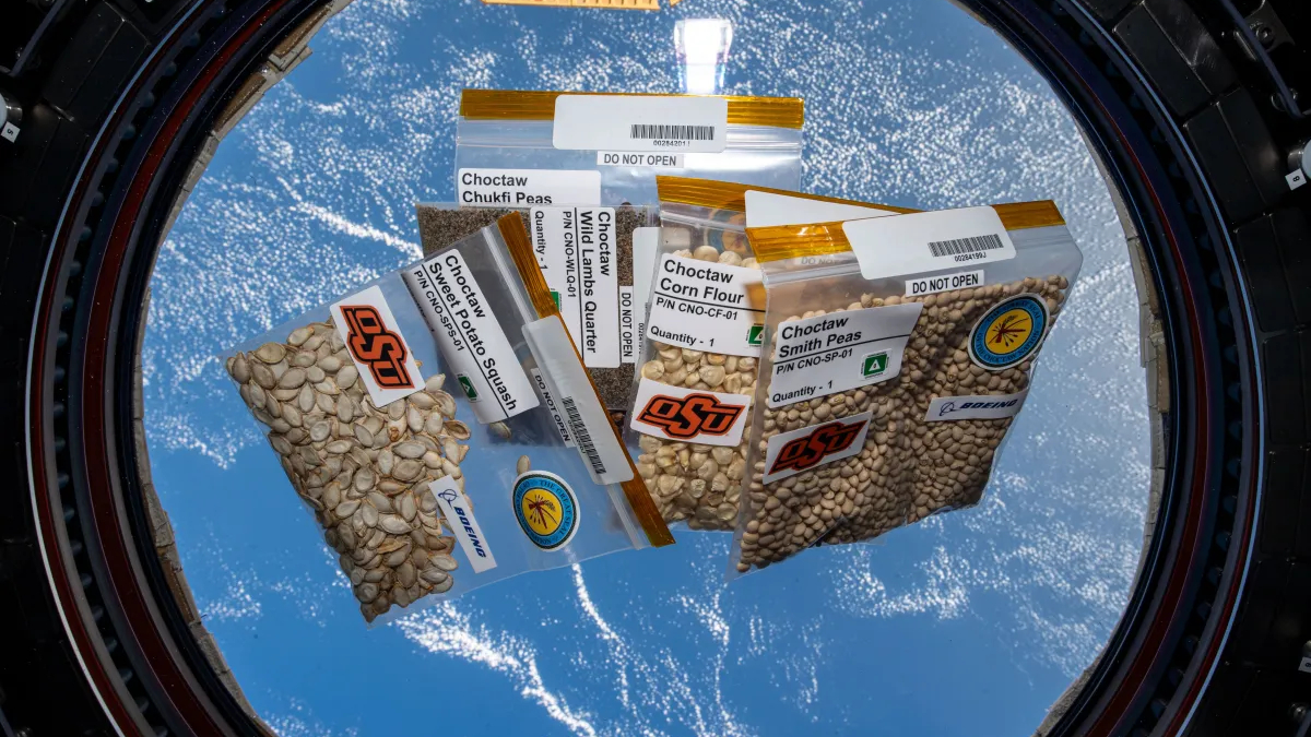 خمسة أصناف من الإرث بذور من أمة الشوكتو في أوكلاهوما – بما في ذلك إيسيتو (شوكتو البطاطا الحلوة)، توبي (سميث بيز)، تانشي توبي (دقيق الذرة)، تفنيشي (لامبسكوارت)، وتشوكفي بيز – تم نقلهم جوًا إلى محطة الفضاء الدولية (محطة الفضاء الدولية) في نوفمبر 2023.