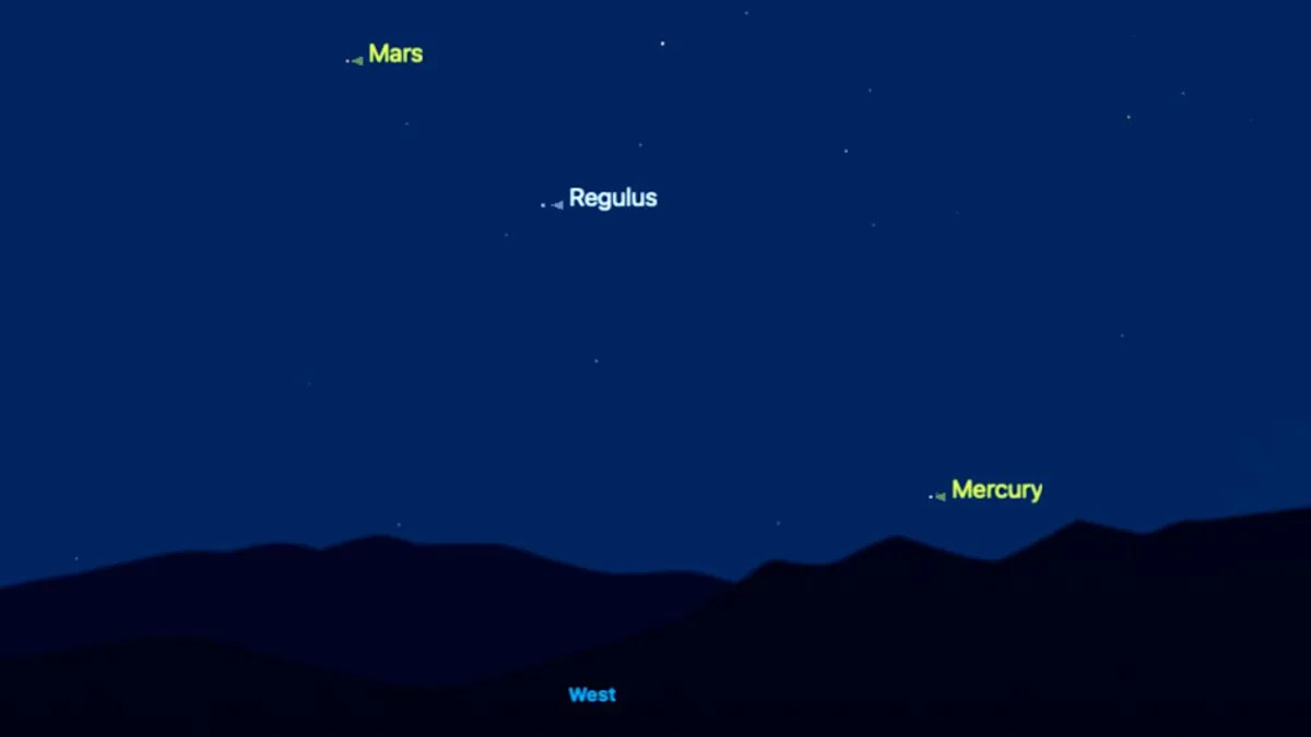 يمكن رؤية الزئبق مع Regulus and Mars في سماء الليل في 4 يوليو. | الائتمان: ليلة النجوم