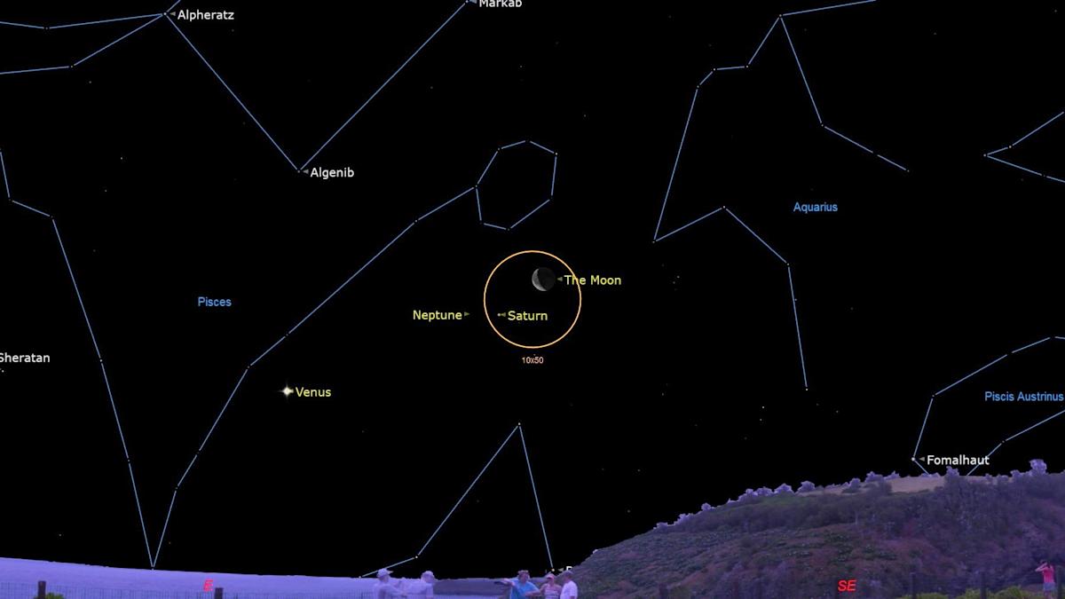 ستشاهد النجوم في الولايات المتحدة أن الثلاثي السماوي يرتفع في حوالي الساعة 3:30 صباحًا بتوقيت شرق الولايات المتحدة (0715 بتوقيت جرينتش) ، مع قمر الهلال الذي يتراجع عن الأرض المرتفعة ضخامة 1.14 زحل ، والتي ستكون مرئية حوالي أربع درجات إلى أسفل اليسار في السماء الشرقية. نبتون – غير مرئي للعين المجردة عند الحجم 7.92 – يمكن العثور على كامن حوالي درجتين (أو عرض إصبعين) على يسار زحل. (على مقياس الحجم الذي يستخدمه علماء الفلك ، تشير الأرقام الأدنى إلى كائنات أكثر إشراقًا). على سبيل المثال ، في ألمعه ، يضيء كوكب فينوس بحجمه حوالي -4.6.)