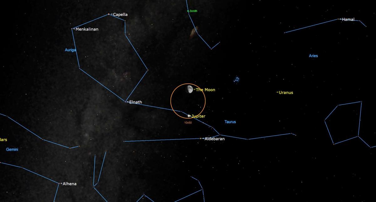 في منتصف الطريق ، بعد حوالي 45 دقيقة من غروب الشمس ، تبدو عالية في الجنوب الشرقي ، أكثر من ثلثي الطريق من الأفق إلى النقطة التي تكتشفها مباشرة (الزينيث) وسترى القمر. وتحوم حوالي 5.5 درجة فوقها سيكون كوكب المشتري الرائع (يقيس قبضة المشدودة بطول الذراع 10 درجات ؛ لذلك ، سيظهر القمر والمشتري تقريبًا نصف قبضة).