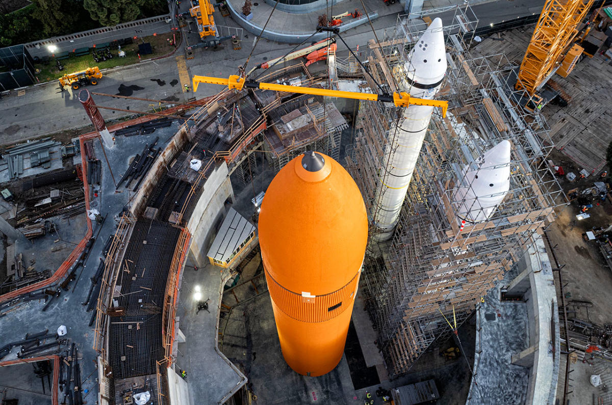 وقال ممثلو المتحف إن رافعة يبلغ طولها 450 قدمًا (137 مترًا) ستقوم بتثبيت إنديفور في مكانها المخصص في مركز كاليفورنيا للعلوم “في عملية ضخمة ومليئة بالتحديات الفنية لم يتم إنجازها من قبل خارج منشأة ناسا أو القوات الجوية”. في وصف الحدث.