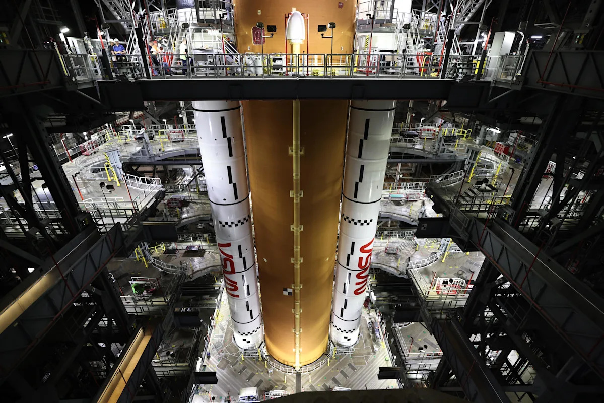 سيتم إخراج صاروخ نظام الإطلاق الفضائي الشاهق التابع لوكالة ناسا والذي يبلغ طوله 322 قدمًا، وهو أقوى معزز تشغيلي في العالم، من مبنى تجميع المركبات الكهفي في وقت مبكر من يوم السبت على متن ناقلة زاحفة مطورة من عصر أبولو. بما في ذلك محطة واحدة على الأقل على طول الطريق، من المتوقع أن يستغرق الانتقال لمسافة 4 أميال إلى المنصة ما بين 8 إلى 10 ساعات.