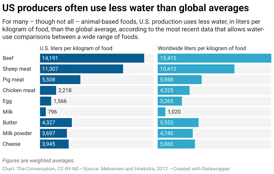 في حين أن التخلص من اللحوم تمامًا ليس هدف الجميع، إلا أن التحولات المتواضعة في النظام الغذائي، سواء تقليل استهلاك اللحوم بشكل عام أو اختيار البروتينات التي تستخدم كميات أقل من المياه لإنتاجها، يمكن أن تخفف الضغط. يتطلب إنتاج رطل من لحم البقر ما يقدر بنحو 1800 جالون من الماء، مقارنة بحوالي 500 جالون للرطل من الدجاج.