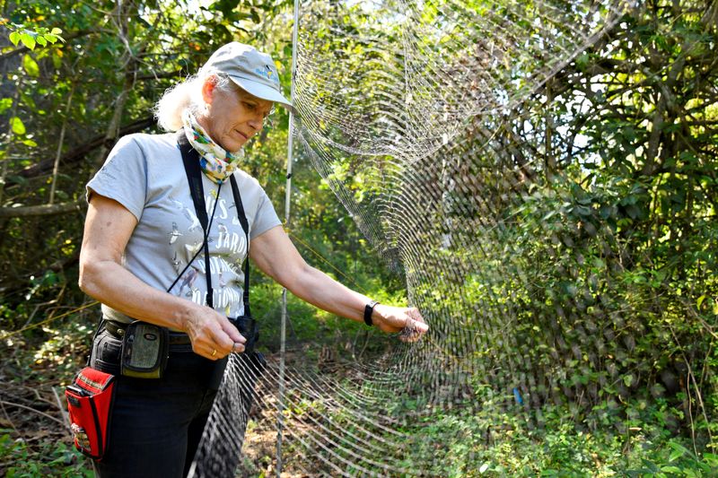 ترتعش شبكتها المشدودة على طريق الغابة في حديقة النباتات في هافانا. طائر كاتبير – وهو طائر رمادي يرتدي ملابس منفصلة وغطاء أسود – يضرب ثم يستسلم عندما تنتزعه من حزام الشبكة غير المرئي تقريبًا.
