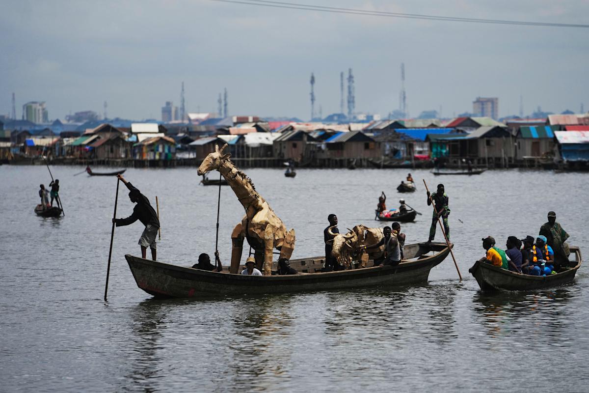 MAKOKO ، نيجيريا (AP) – العديد من الزوارق تجاه Makoko ، فقير عائم شاسع مبني على ركائز في البحيرة في أحد طرفي المركز الاقتصادي في نيجيريا في لاغوس. ركوب على الأوعية هي حيوانات دمية عملاقة من الورق المقوى جنبا إلى جنب مع العرائس الذين يرتدون ملابس سوداء.