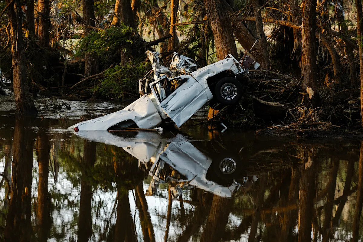 تقع الحطام على طول نهر غوادالوبي في إنغرام ، تكساس ، يوم الثلاثاء. (Jim Vondruska / Getty Images)
