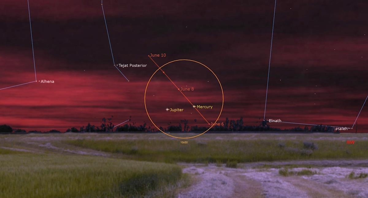 سوف يتناسب الزئبق والمشتري في مجال رؤية زوج من مناظير 10×50 (التي يشار إليها بالدائرة الصفراء) بعد غروب الشمس في 7 يونيو. | الائتمان: ليلة النجوم