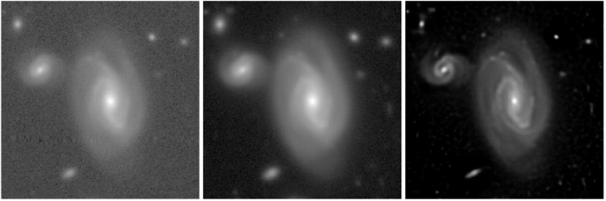 مثال على صورة سوبارو نموذجية (يسار) ، شحذها باستخدام التقنيات المنشأة مسبقًا (الأوسط) والصورة الحادة النهائية بواسطة ImageMm (يمين). | الائتمان: Yashil Sukurdeep (جامعة جونز هوبكنز) وآخرون/سوبارو تلسكوب.