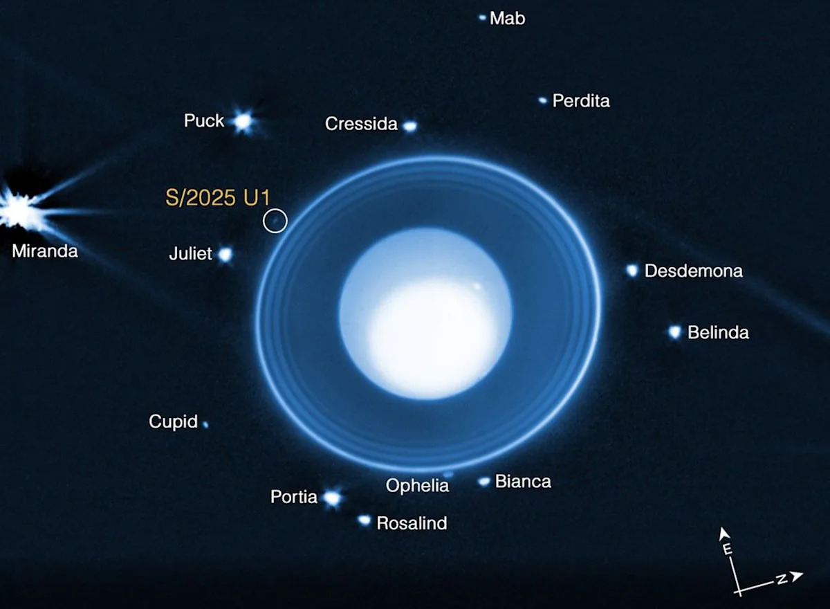 يورانوس لديه خمسة أقمار خارجية تدعى ميراندا ، أرييل ، أومبريل ، تيتانيا وأوبرون. وقال الباحثون إن القمر المكتشف حديثًا داخل مدارات الأقمار الخمسة الأكبر.
