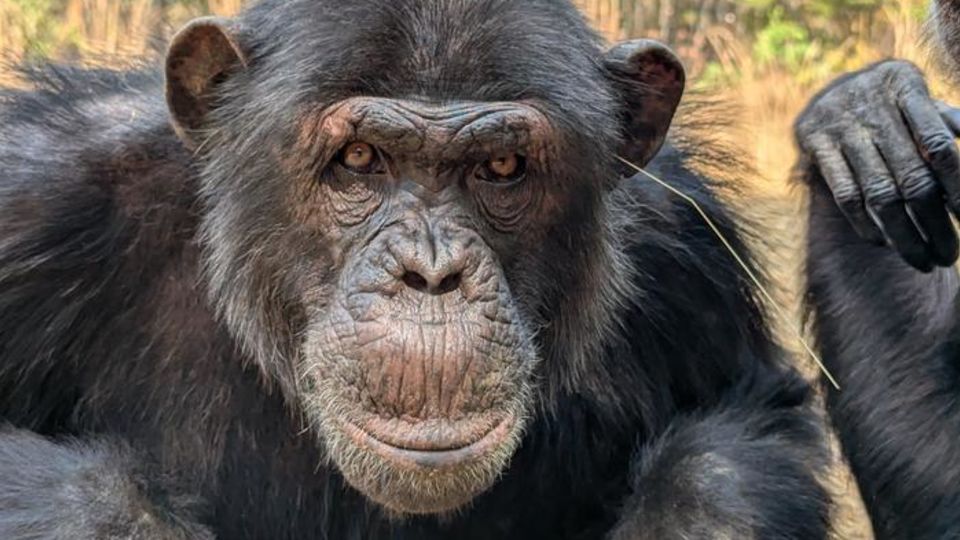 يُظهر شمبانزي من الذكور البالغ نفس السلوك في ملاذ غابات للقردة العظيمة التي تم إنقاذها. – Jake Brooker/Chimfunshi Wildlife Trust Trust