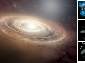 قرص عريض ومسطح من الغازات بنقطة مركزية بيضاء ناصعة يمتد عبر مساحة شاسعة.