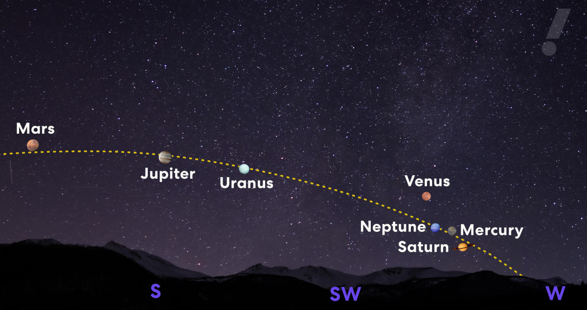 ستكون محاذاة الكواكب مرئية في جميع أنحاء العالم تقريبًا في مساء يوم 28 فبراير. ومع ذلك ، فإن مواقع مثل المكسيك ونيويورك ستحصل على أفضل رؤية في 25 فبراير ، في حين أن مومباي وبكين وسيدني ستحصل على أفضل رؤية في 3 مارس ، وفقا لنجوم ووك.
