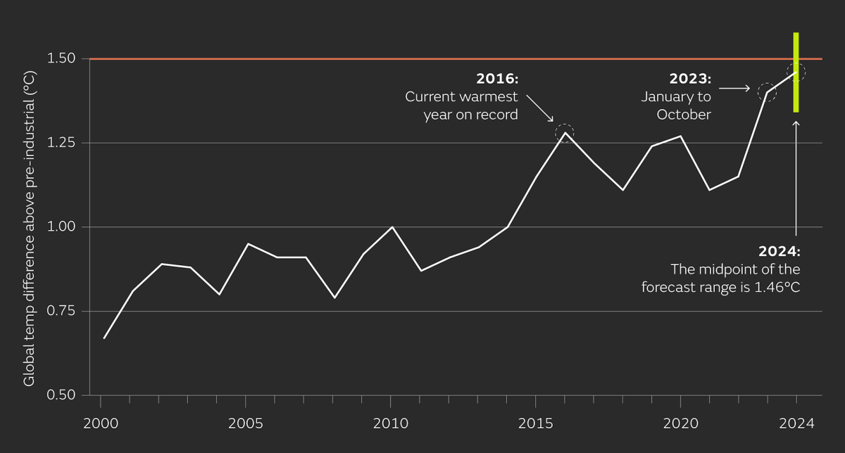 من المرجح أن يتجاوز العام المقبل 2023 باعتباره العام الأكثر سخونة على الإطلاق، وفقًا لمكتب الأرصاد الجوية في المملكة المتحدة، الذي يتوقع أن يكون عام 2024 أكثر دفئًا بمقدار 1.46 درجة مئوية مقارنة بأوقات ما قبل الصناعة، لكنه قد ينتهي بما يصل إلى 1.58 درجة مئوية. ويهدف اتفاق باريس إلى إبقاء ارتفاع درجات الحرارة على المدى الطويل أقل من 1.5 درجة مئوية.