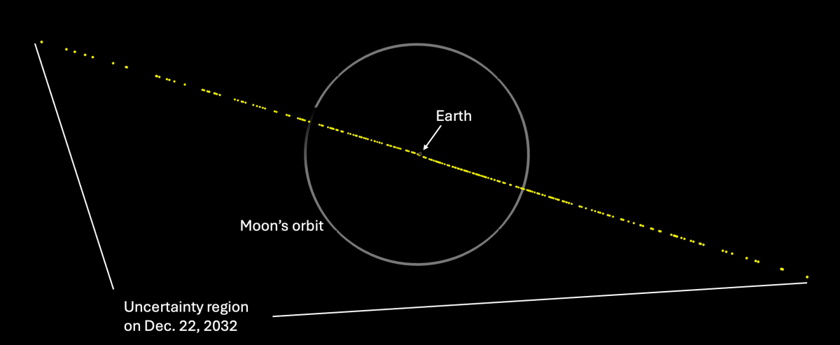 تُظهر النقاط الصفراء عدم اليقين في الموقف من الكويكب 2024 YR4 عندما تواجه الأرض في عام 2032 ، بناءً على ملاحظات حتى 31 يناير 2025. يتقاطع 2 ٪ فقط من هذه المنطقة ، على الأكثر ، على الأرض ، وهي النقطة الصغيرة في المركز من مدار القمر. / الائتمان: ناسا